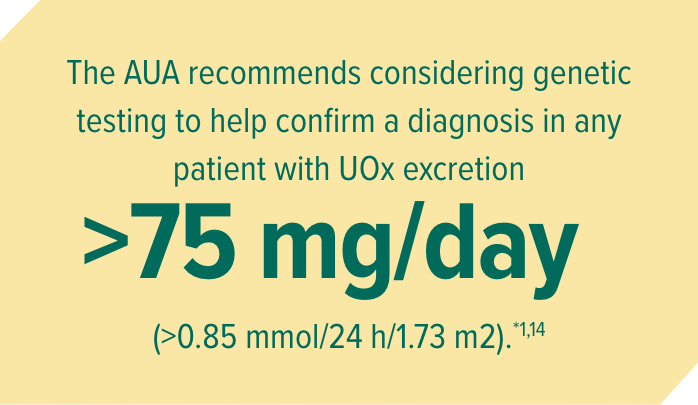 1. Milliner DS, Harris PC, Sas DJ, et al. GeneReviews®. University of Washington, Seattle; 1993-2022. 2. Hopp K, Cogal AG, Bergstralh EJ, et al. J Am Soc Nephrol. 2015;26(10):2559-2570. 3. Hoppe B, Beck BB, Milliner DS. Kidney Int. 2009;75(12):1264-1271. 4. Hoppe B. Nat Rev Nephrol. 2012;8(8):467-475. 5. Cochat P, Rumsby G. N Engl J Med. 2013;369(7):649-658. 6. Cochat P, Hulton SA, Acquaviva C, et al. Nephrol Dial Transplant. 2012;27(5):1729-1736. 7. Bhasin B, Ürekli HM, Atta MG. World J Nephrol. 2015;4(2):235-244. 8. El-Reshaid K, Al-Bader D, Madda JP. Saudi J Kidney Dis Transpl. 2016;27(3):606-609. 9. van der Hoeven SM, van Woerden CS, Groothoff JW. Nephrol Dial Transplant. 2012;27(10):3855-3862. 10. Garrelfs SF, Oosterveld MJ, Hulton S, et al. Ped Nephrol. 2017;32:1643-1834. 11. Groothoff JW, Metry E, Deesker L, et al. Nat Rev Nephrol. 2023;19:194-211. 12. Zhao F, Bergstralh EJ, Mehta RA, et al. Clin J Am Soc Nephrol. 2016;11(1):119-126. 13. Mayo Clinic Laboratories. Accessed August 5, 2024. https://www.mayocliniclabs.com/test-catalog/download-setup.php?format=pdf&unit_code=606472. 14. Pearle MS, Goldfarb DS, Assimos DG, et al. J Urol. 2014;192(2):316-324. 15. OXLUMO [package insert]. Cambridge, MA: Alnylam Pharmaceuticals, Inc.